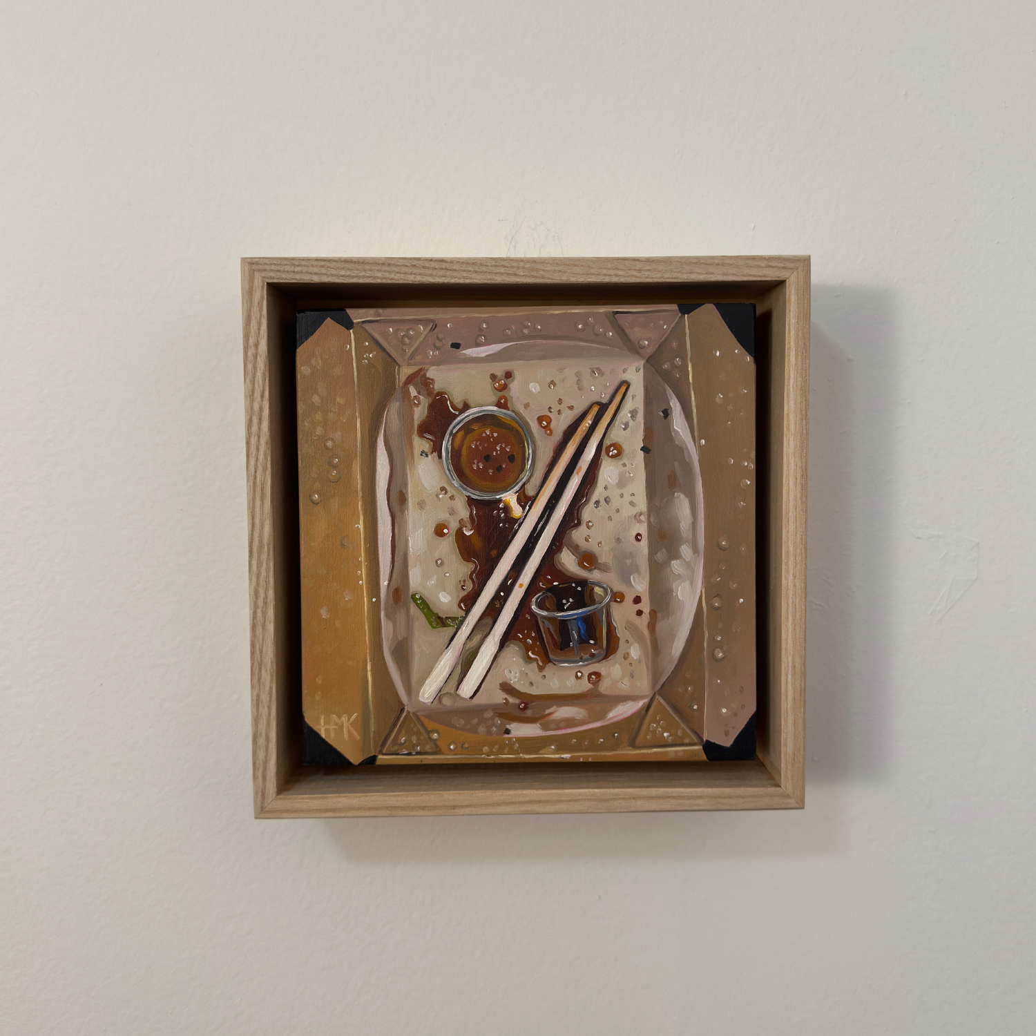 This is a 6x6” oil painting on a gallery thick, 1.5” birch wood panel, installed in a 7x7x2" (18x18x5 cm) baltic ash float frame. The scene features a top-down scene of an empty takeout container with spilled dipping sauces and chop sticks.